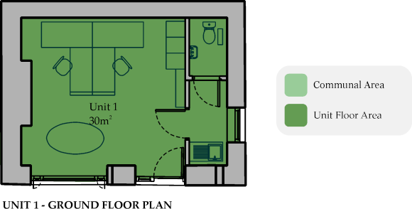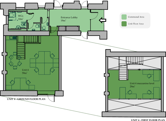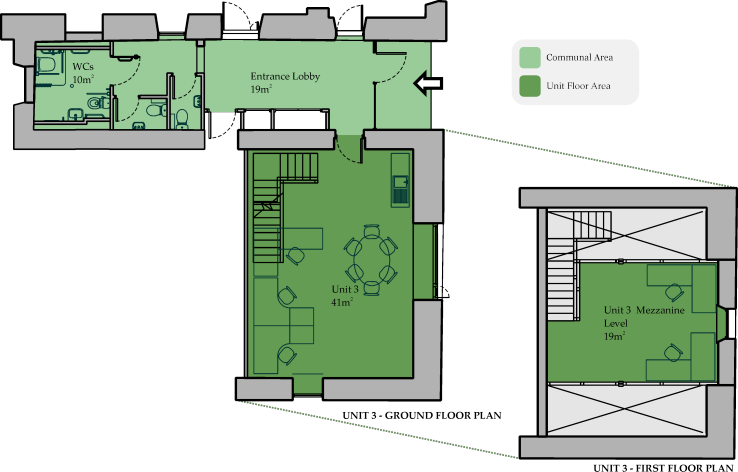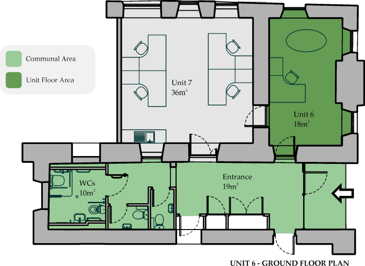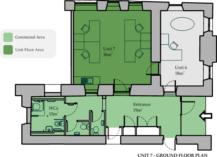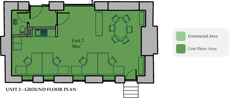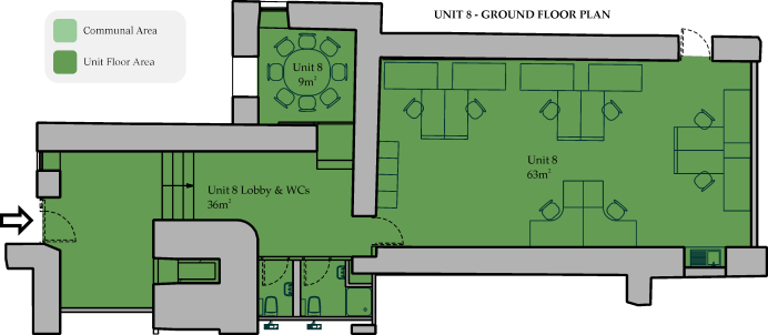 The Communal Meeting RoomThe Meeting Room is located on the east side of the building, and with a floor area of 36m2 (388ft2) makes an ideal office space. Click here to find our more about the Meeting Room. ![]() |