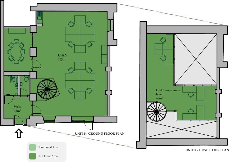 The ForgeLocated on the east side of the building, The Forge has its own dedicated entrance, toilet and shower facilities. The unit also occupies the ground floor of the clock tower which gives a space ideally suited for use as a meeting room seperate to the main office. In total, the unit has a floor area of 108m2 (1163ft2). ![]() |